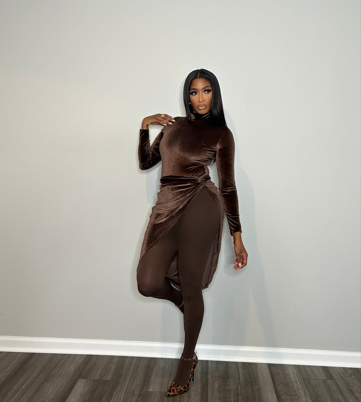 This velvet set shows so much sophistication with a touch of sexiness. Features a velvet high collar bodysuit & knot skirt to cover.